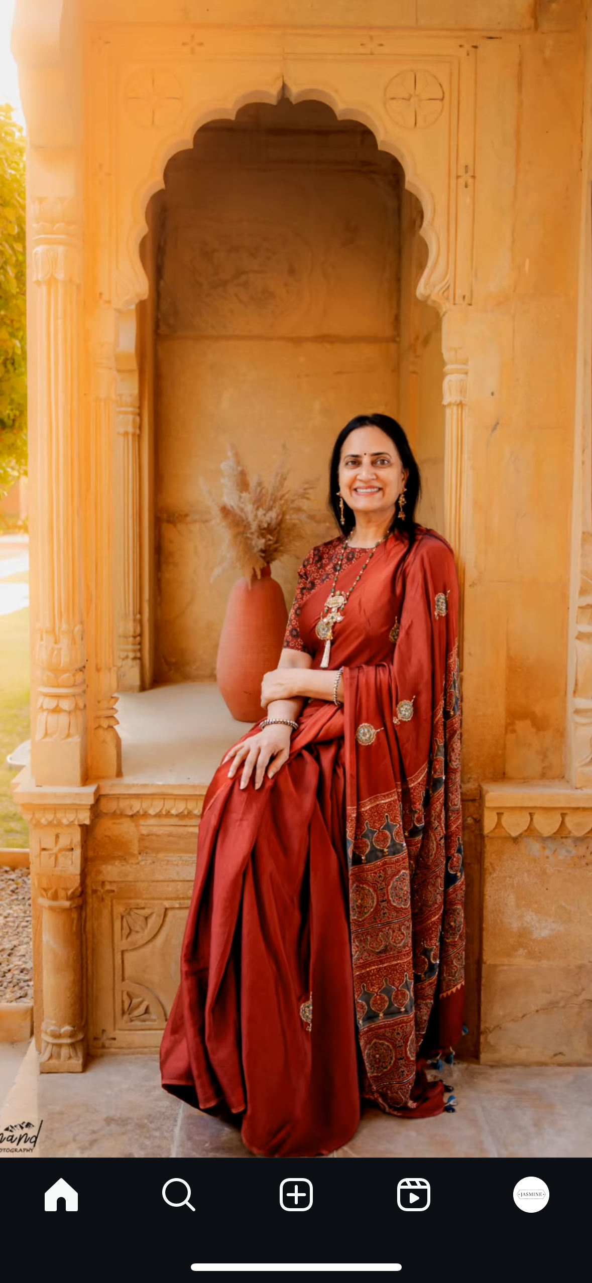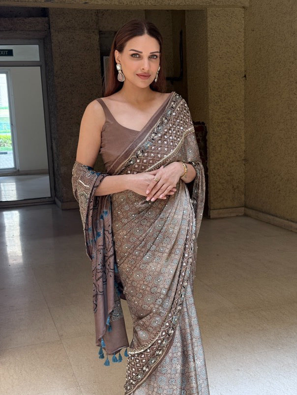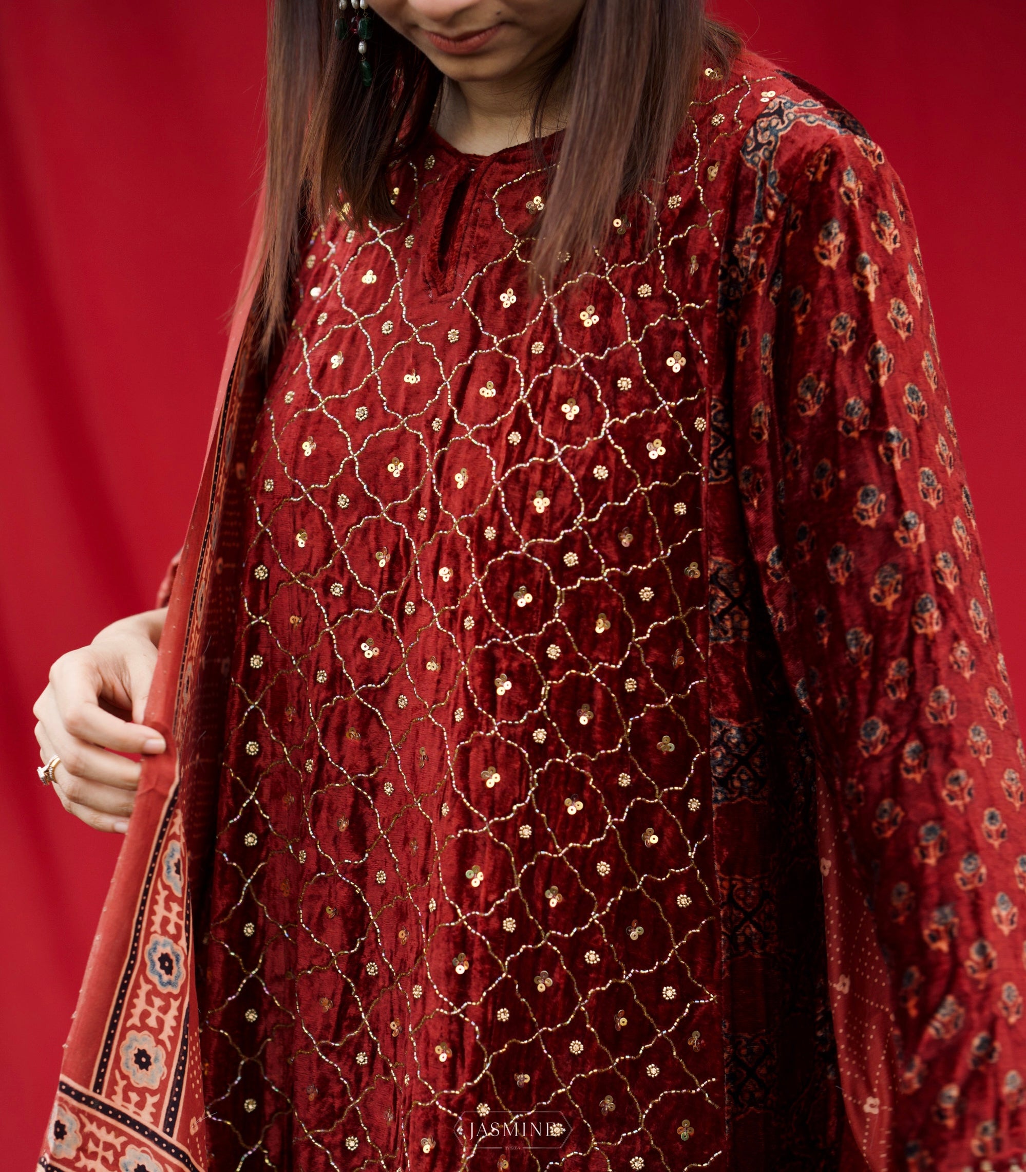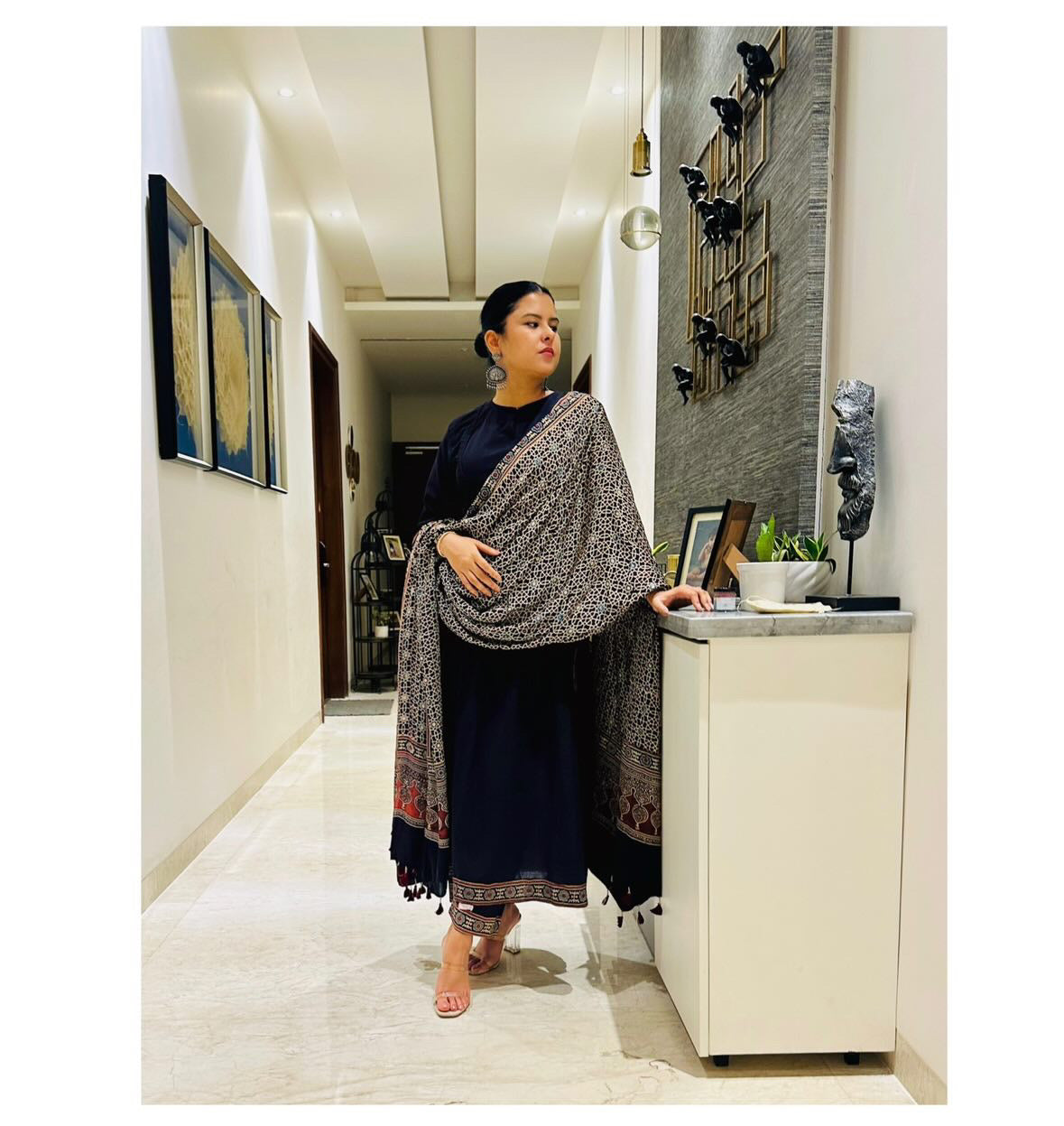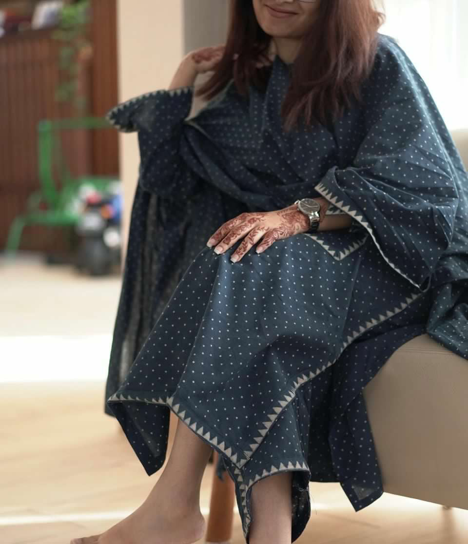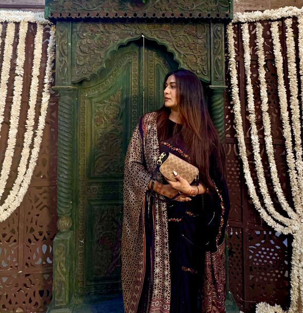 Ajrakh, an exclusive block printing technique is said to be based on the theme of the universe where red resembles the earth, black space, blue the sky, and oceans with geometric designs as stars on it. Truly bringing down the soul of the universe on a piece of cloth.